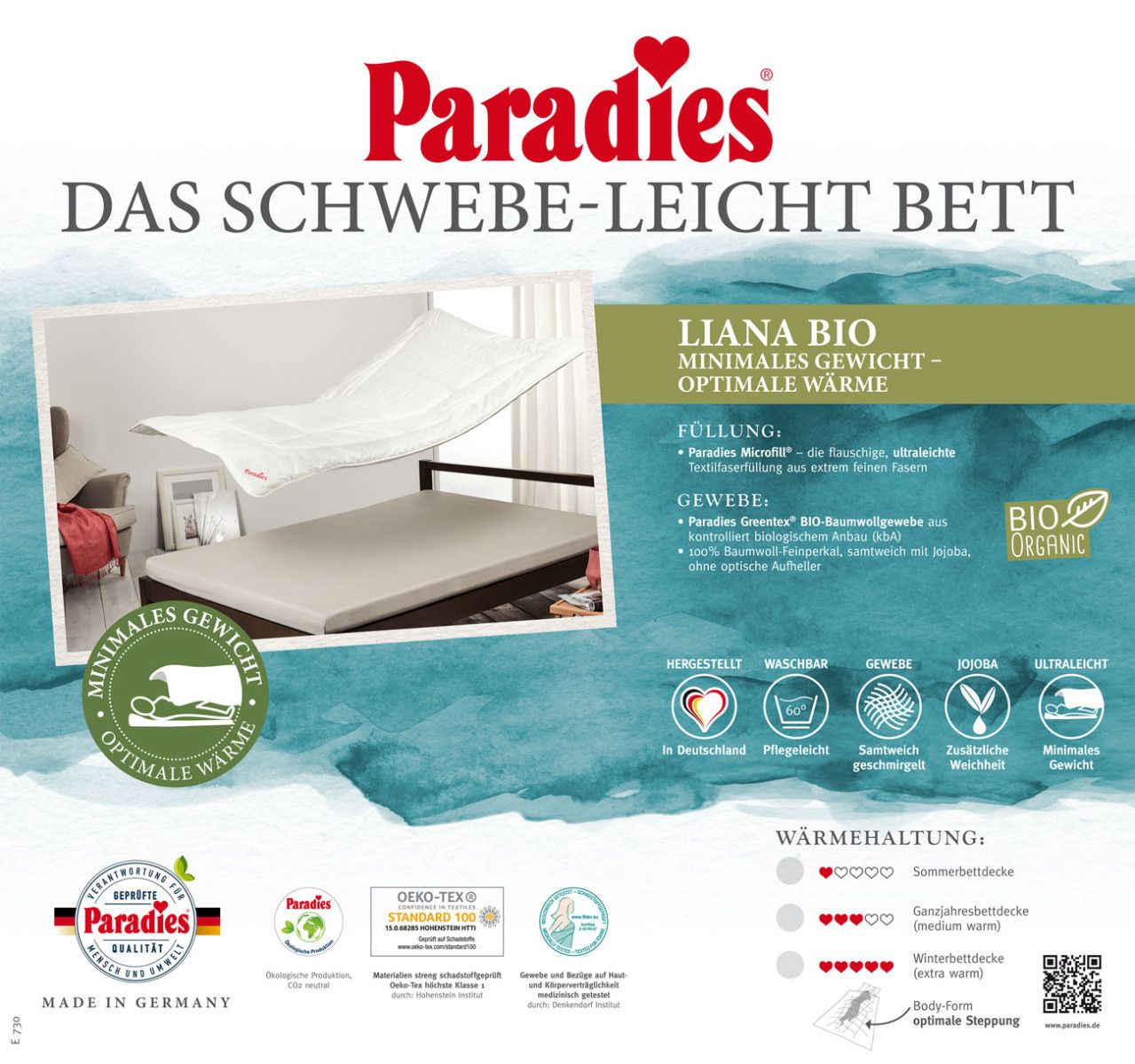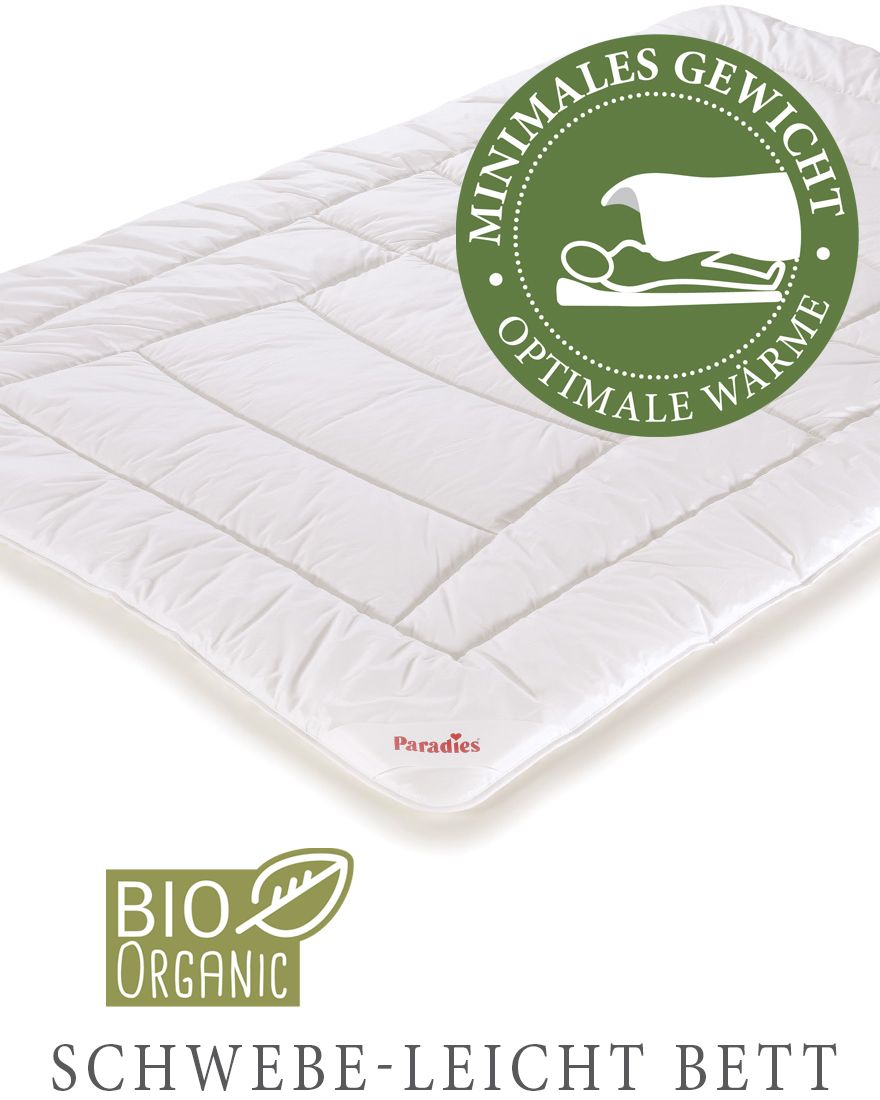 CLARA bedding nabízí Luxus nadosah—Bohatý výběr materiálů, barev a vzorů.• Přikrývka ze série Microfill Steppbett - Paradies - je vhodná pro teplejší roční období.• Plovoucí lehká přikrývka od Paradies s nadýchanou a ultra lehkou textilní vláknovou náplní Paradies Microfill zajišťuje pohodlný spánek. • Díky své minimální hmotnosti je peřina zvláště příjemná za teplých letních nocí. • Pro tkaninu byla vybrána jemná organická bavlněná tkanina. • Je sametově jemně pískovaný, navíc rafinovaný jojobou, a tak zanechává nádherný pocit. • Tento produkt je vhodný pro každého, kdo hledá nesrovnatelnou lehkost s vysokou prodyšností a perfektní výměnou teploty a vlhkosti. • Obzvláště doporučeno pro děti a lidi, kteří si chtějí prát své prádlo v pračce sami. • Vzhledem k menšímu objemu lze jej snadno prát v domácí pračce. • Lze prát do 60 ° C, vhodné pro sušení v bubnu. • Paradies BIO-Light je letní peřina, která díky své minimální hmotnosti umožňuje dobře spát i za teplých letních nocí.• Tento model je klasický letní model ze série UltraLoft "nízký teplotní stupeň 1" umožňuje použití v létě i v méně větrané ložnici.• Povlak: speciální, vysoce kvalitní Bavlna, hedvábně jemná a hladký Perkal (100% bavlna), "Zelená bavlněná tkanina Greentex" z certifikovaného ekologického pěstování.• Náplň: fiberfill textilní vlákno (100% polyester).• Nesrovnatelně lehké a jemné (výroba vlákna prostřednictvím unikátních vysoce lehčených technologií).• Péče: prát do 60°C.