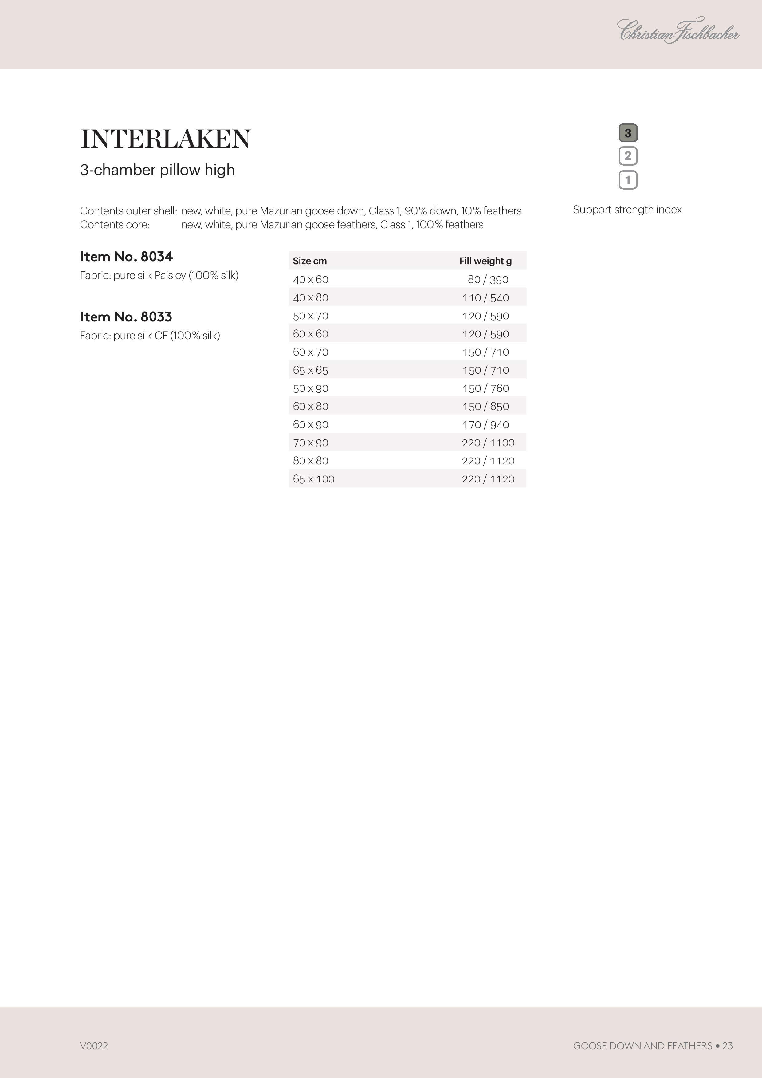 Vysoce kvalitní prachové peří a peří jako výplňový materiál • Všechny výrobky z prachového peří a peří byly oceněny exkluzivní pečetí VSB a jsou vyráběny ve Švýcarsku nebo Lichtenštejnsku. • Používáme pouze to nejlepší prachové peří a peří z „veselé husy krmené ovsem“ z Mazur v Polsku. • Pro naše přikrývky z kajčího peří se používá ručně vybírané islandské kajčí peří, nejexkluzivnější výplňový materiál na světě.Vysoce kvalitní přírodní srst a syntetická vlákna • Nejkvalitnější výplně, jako je jačí srst nebo divoké hedvábí, pro milovníky exkluzivních lůžkovin z přírodního vlasu. • Nabídku doplňují výrobky z vysoce kvalitních syntetických vláken, které jsou vyrobeny z nejjemnějších polyesterových vláken.Potahové tkaniny nejvyšší kvality • Pro tkaniny našich péřových přikrývek používáme SWISS BATIST, který se vyznačuje jedinečným omakem, lehkostí a vysokou prodyšností. • Hedvábné tkaniny jsou obzvlášť měkké a působí luxusně. • Všechny výrobky získaly označení OEKO•TEX®.Jaký je index pevnosti podpory?Polštáře by měly podpírat hlavu a umožňovat uvolnění krčních svalů. Protože optimální tuhost závisí na individuálních spánkových návycích, vyvinula společnost DORBENA index pevnosti opory, který uvádíme na každém polštáři. Jak je uvedeno, nabízíme naše polštáře s výplní nízkou, střední, vysokou a nastavitelnou.Všechny hodnoty jsou orientační a mají pomoci při výběru přikrývky a polštáře.