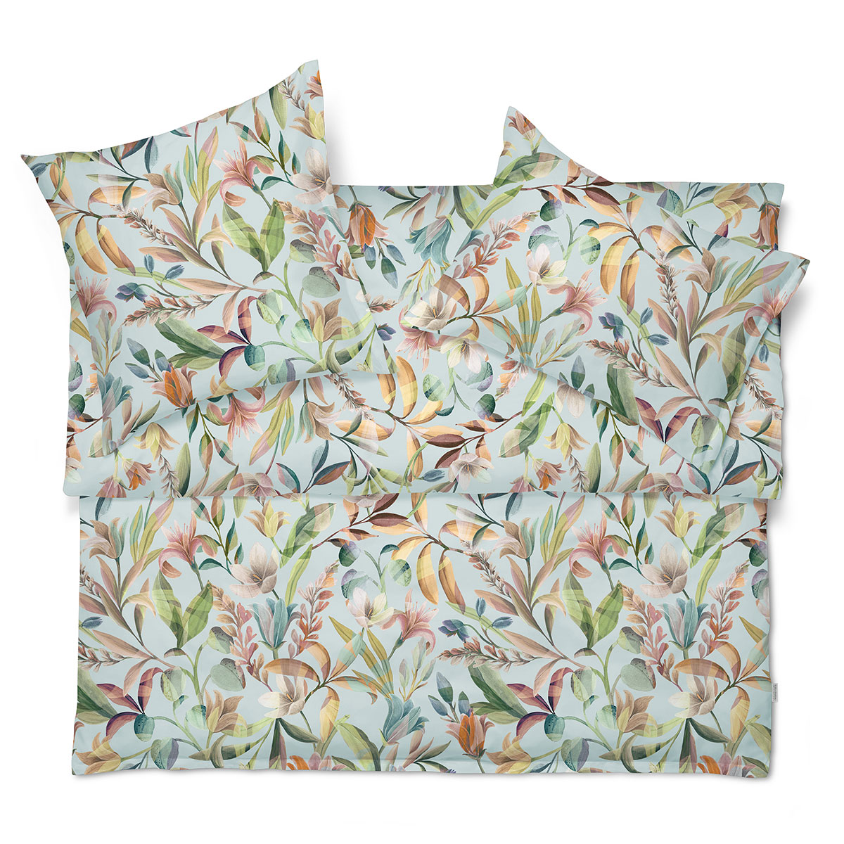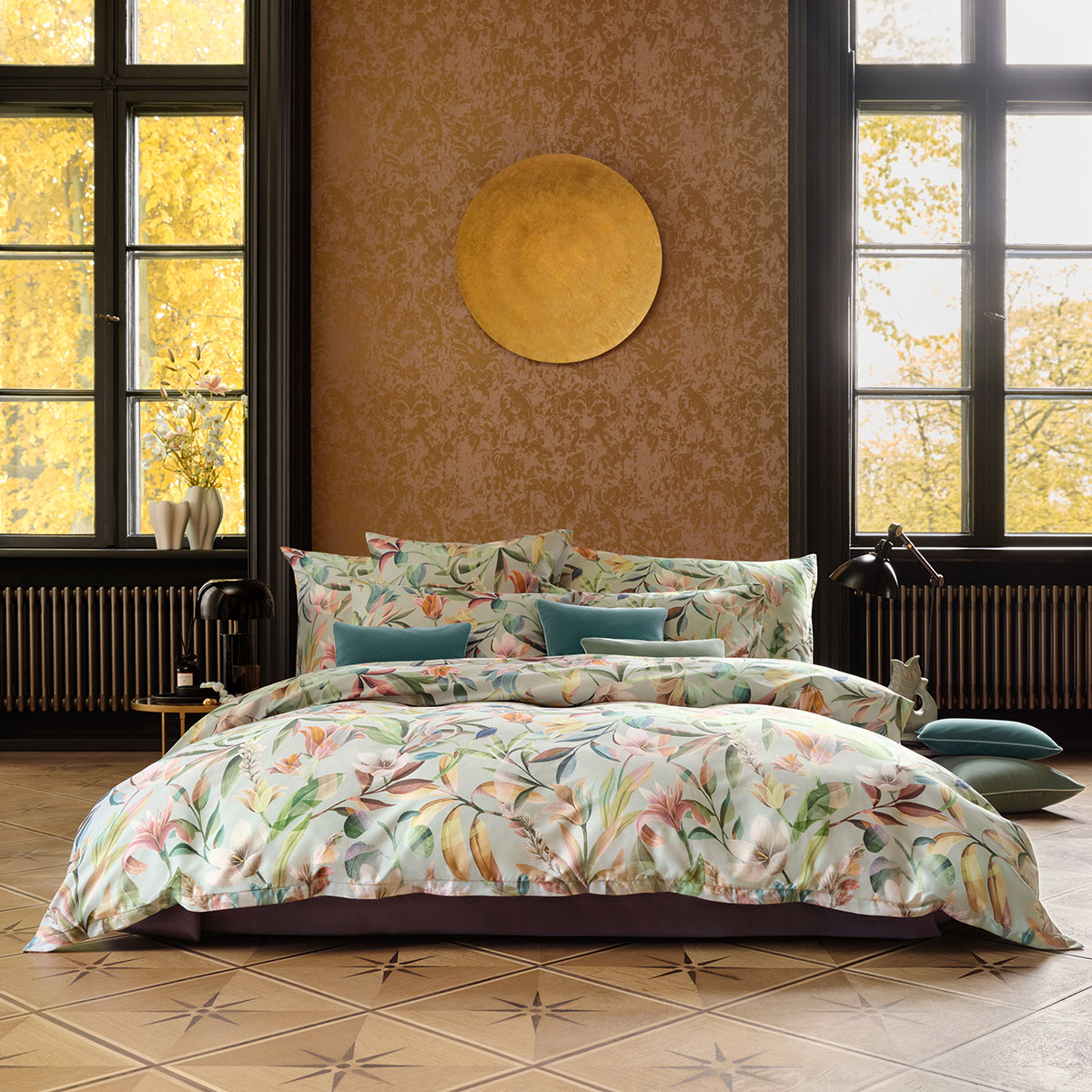 CLARA bedding nabízí Luxus na dosah—Bohatý výběr materiálů, barev a vzorů.• Tento okamžik zlatavého světla na ložním prádle ADÈLE zvěstuje svou jemnou bohatostí příchod podzimu a přesně vystihuje tuto mnohotvárnou atmosféru nádhery a hojnosti. • Vyladěná hra barev z mihotavých slunečních paprsků a listí pokrytého lehce zmrzlou rosou zvýrazňuje tlumené podzimní tóny na listové zeleni, zatímco rozkvetlý barevný ráj spočívá ve svém vlastním dramatickém charakteru. • ADÈLE je nakreslena akvarelem a zvěčněna na šalvějově zeleném podkladu.• Umělecký ručně malovaný design z ateliéru v Turbenthalu.• Tato povlečení patří k nejluxusnějším v Evropě.• Moderní technologie a vynikající řemeslné zpracování, ale také filozofie designu a povědomí o životním prostředí. • Vysoce kvalitní Jemný Švýcarský Mako Satén - 100% česaná extra dlouhovlákenná mako bavlna - Satén Noblesse.• Jedná se o bavlněný satén, který je mercerisován. Tato úprava zvyšuje lesk látky a také odolnost proti opotřebování, tím je zaručena dlouhá životnost výrobku. • Materiál je velmi jemný, lehký a příjemný k pokožce. • Vhodná barva prostěradla - perle – palmier – rose z kategorie Luxusní prostěradla Schlossberg nebo dle Vašeho výběru.• Povlečení je možné doplnit i o jednobarevné povláčky z kolekce Luxusní jednobarevné povlečení ze švýcarského mako saténu Schlossberg - nebo mako jersey Royal - Schlossberg.• Toto povlečení je možné nechat zhotovit dle přání i s knoflíkovým uzávěrem, polštáře se sámem apod... V případě zájmu nás prosím kontaktujte.• Smyslná lehkost bytí.