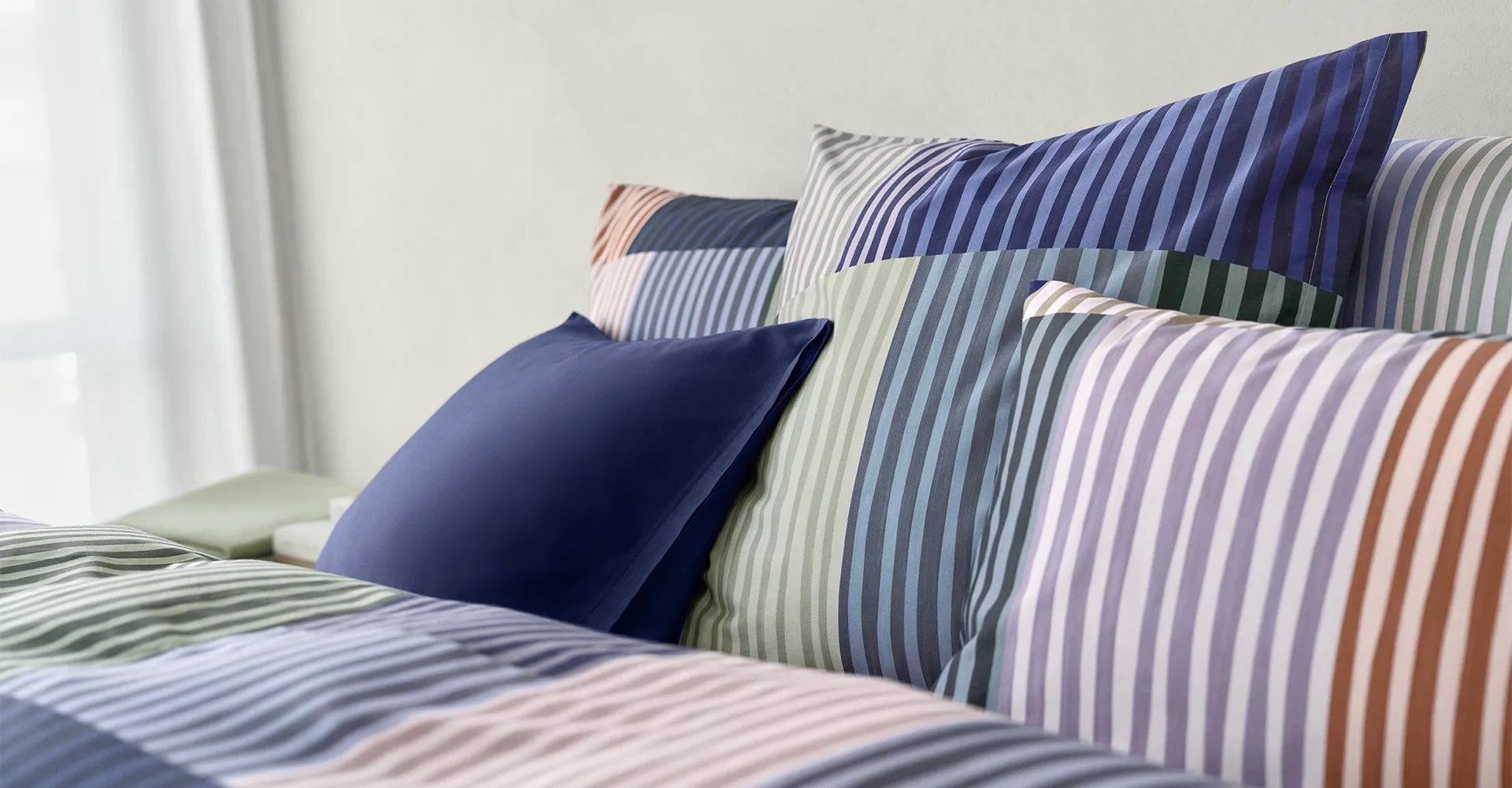 • Grafický design, který přetváří klasické pruhy a zároveň ponechává prostor pro vaši individuální interpretaci – pruhy namalované tlustým štětcem a kvašovými barvami se řadí na ložní prádlo MELVIN, tvoří velké plochy různých velikostí a vlní se ve svém vlastním rytmu.