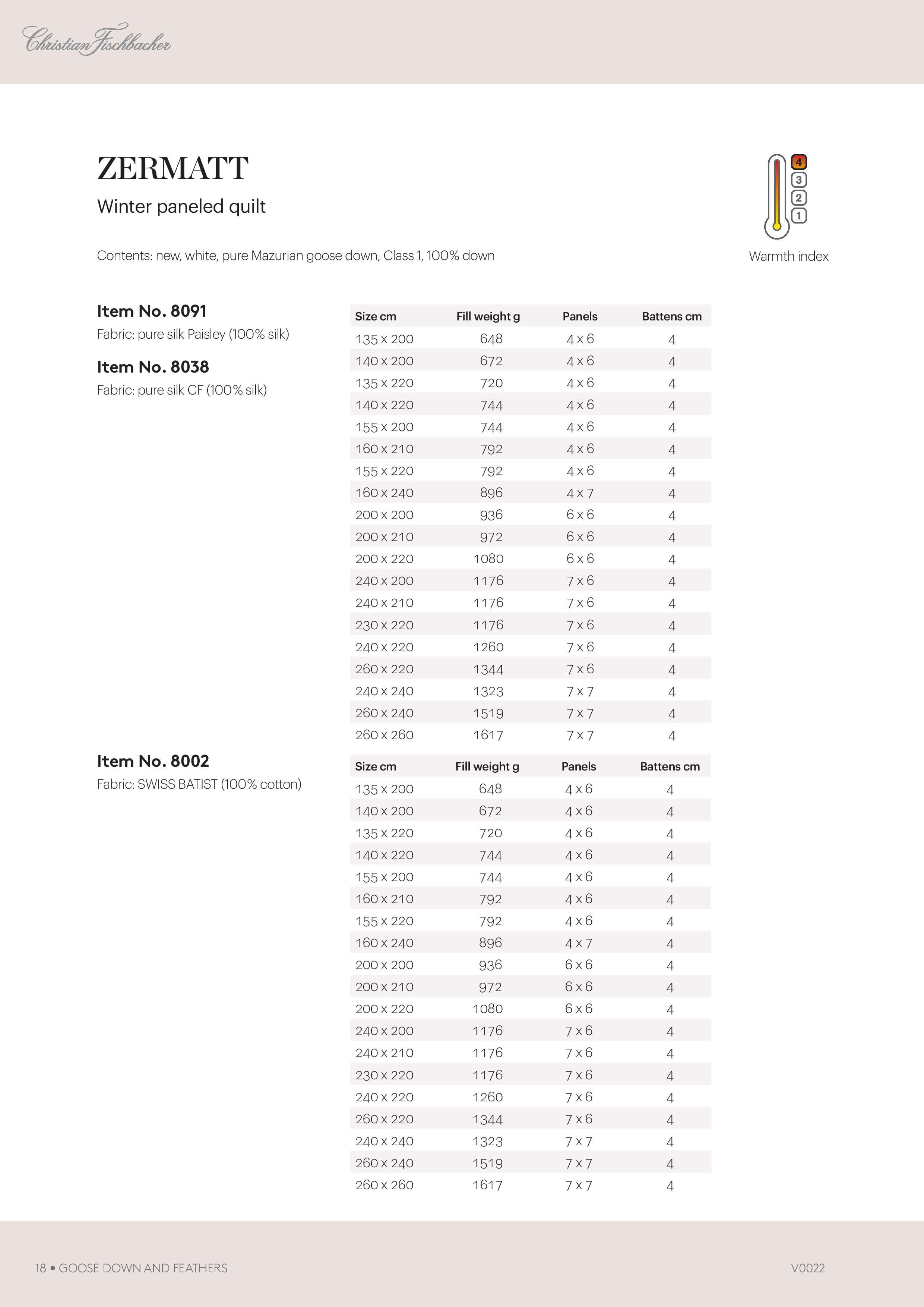 Vysoce kvalitní prachové peří a peří jako výplňový materiál • Všechny výrobky z prachového peří a peří byly oceněny exkluzivní pečetí VSB a jsou vyráběny ve Švýcarsku nebo Lichtenštejnsku. • Používáme pouze to nejlepší prachové peří a peří z „veselé husy krmené ovsem“ z Mazur v Polsku. • Pro naše přikrývky z kajčího peří se používá ručně vybírané islandské kajčí peří, nejexkluzivnější výplňový materiál na světě.Vysoce kvalitní přírodní srst a syntetická vlákna • Nejkvalitnější výplně, jako je jačí srst nebo divoké hedvábí, pro milovníky exkluzivních lůžkovin z přírodního vlasu. • Nabídku doplňují výrobky z vysoce kvalitních syntetických vláken, které jsou vyrobeny z nejjemnějších polyesterových vláken.Potahové tkaniny nejvyšší kvality • Pro tkaniny našich péřových přikrývek používáme SWISS BATIST, který se vyznačuje jedinečným omakem, lehkostí a vysokou prodyšností. • Hedvábné tkaniny jsou obzvlášť měkké a působí luxusně. • Všechny výrobky získaly označení OEKO•TEX®.Co je to index tepla?Společnost DORBENA AG vyvinula v úzké spolupráci s Mezistátní vysokou školou technickou NTB (NTB Interstaatliche Hochschule für Technik) Buchs vysoce citlivý počítačový měřicí systém pro klasifikaci hřejivosti přikrývek. Tato klasifikace - index hřejivosti - zohledňuje a třídí dva specifické parametry, které určují vlastnosti přikrývky. • Schopnost přikrývky udržet teplo • Absorpce vlhkosti přikrývkyOba parametry společně umožňují rozdělit přikrývky do čtyř kategorií. U každé přikrývky uvádíme podrobnosti o indexu hřejivosti.