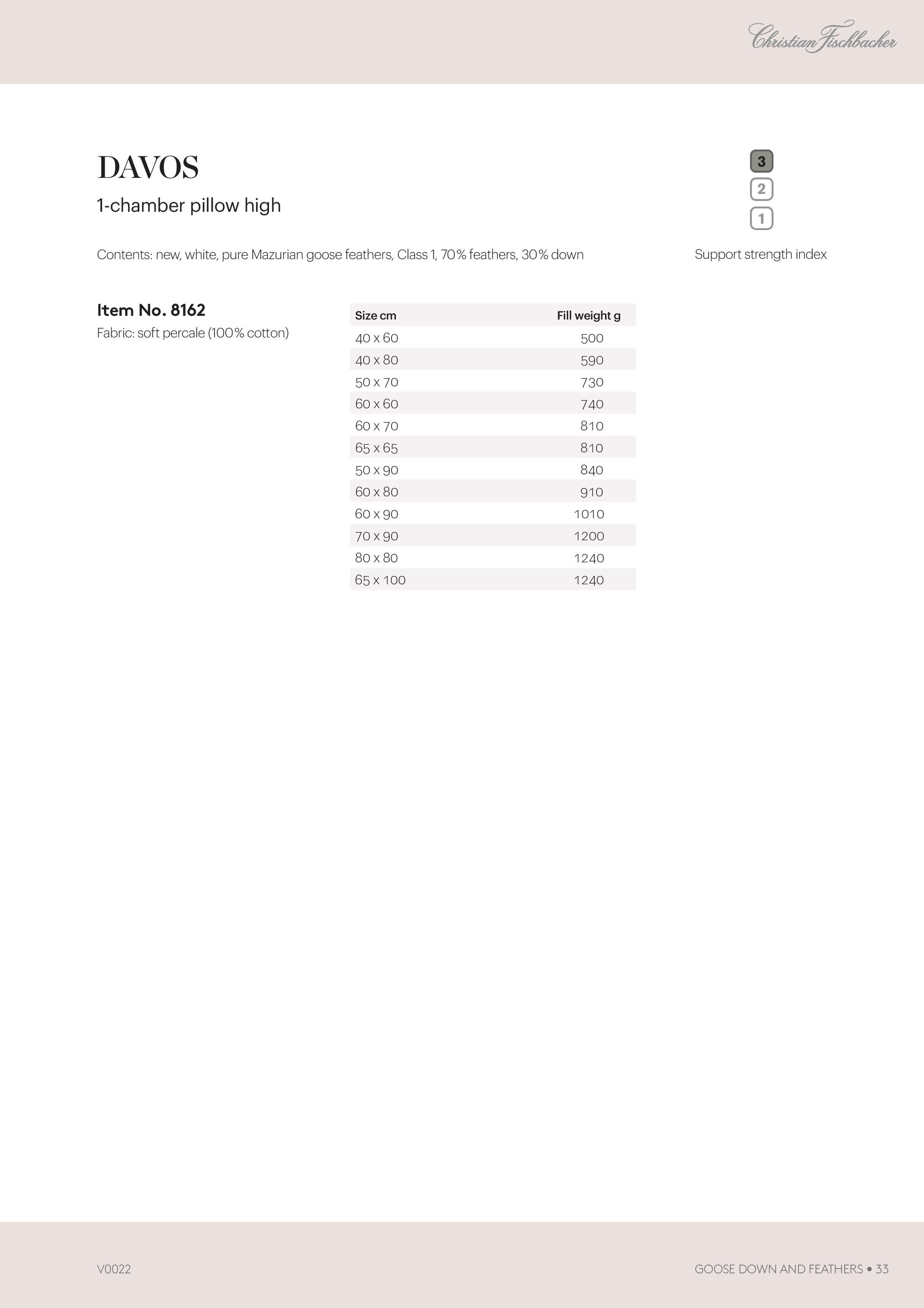 Vysoce kvalitní prachové peří a peří jako výplňový materiál • Všechny výrobky z prachového peří a peří byly oceněny exkluzivní pečetí VSB a jsou vyráběny ve Švýcarsku nebo Lichtenštejnsku. • Používáme pouze to nejlepší prachové peří a peří z „veselé husy krmené ovsem“ z Mazur v Polsku. • Pro naše přikrývky z kajčího peří se používá ručně vybírané islandské kajčí peří, nejexkluzivnější výplňový materiál na světě.Vysoce kvalitní přírodní srst a syntetická vlákna • Nejkvalitnější výplně, jako je jačí srst nebo divoké hedvábí, pro milovníky exkluzivních lůžkovin z přírodního vlasu. • Nabídku doplňují výrobky z vysoce kvalitních syntetických vláken, které jsou vyrobeny z nejjemnějších polyesterových vláken.Potahové tkaniny nejvyšší kvality • Pro tkaniny našich péřových přikrývek používáme SWISS BATIST, který se vyznačuje jedinečným omakem, lehkostí a vysokou prodyšností. • Hedvábné tkaniny jsou obzvlášť měkké a působí luxusně. • Všechny výrobky získaly označení OEKO•TEX®.Jaký je index pevnosti podpory?Polštáře by měly podpírat hlavu a umožňovat uvolnění krčních svalů. Protože optimální tuhost závisí na individuálních spánkových návycích, vyvinula společnost DORBENA index pevnosti opory, který uvádíme na každém polštáři. Jak je uvedeno, nabízíme naše polštáře s výplní nízkou, střední, vysokou a nastavitelnou.Všechny hodnoty jsou orientační a mají pomoci při výběru přikrývky a polštáře.
