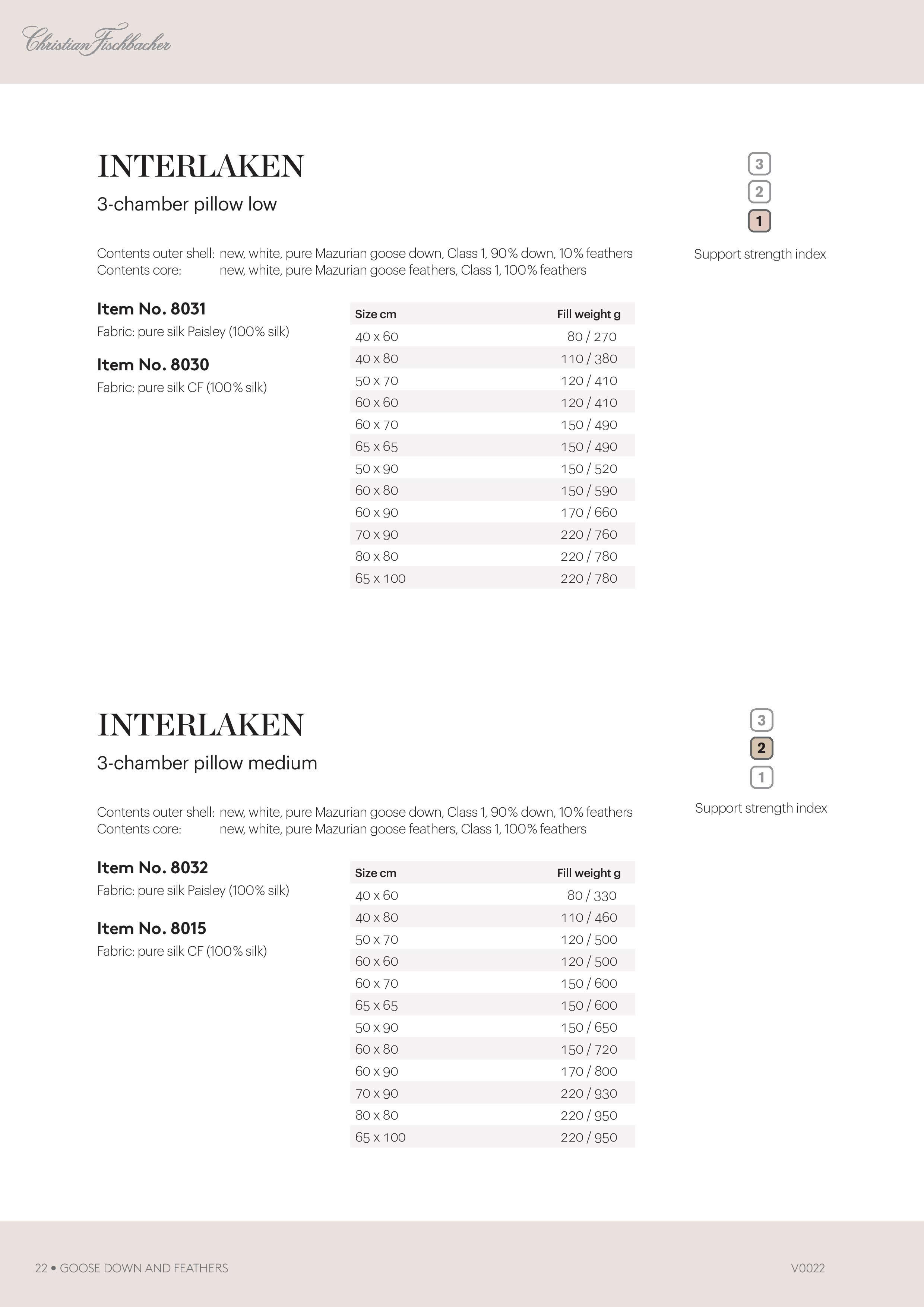 Vysoce kvalitní prachové peří a peří jako výplňový materiál • Všechny výrobky z prachového peří a peří byly oceněny exkluzivní pečetí VSB a jsou vyráběny ve Švýcarsku nebo Lichtenštejnsku. • Používáme pouze to nejlepší prachové peří a peří z „veselé husy krmené ovsem“ z Mazur v Polsku. • Pro naše přikrývky z kajčího peří se používá ručně vybírané islandské kajčí peří, nejexkluzivnější výplňový materiál na světě.Vysoce kvalitní přírodní srst a syntetická vlákna • Nejkvalitnější výplně, jako je jačí srst nebo divoké hedvábí, pro milovníky exkluzivních lůžkovin z přírodního vlasu. • Nabídku doplňují výrobky z vysoce kvalitních syntetických vláken, které jsou vyrobeny z nejjemnějších polyesterových vláken.Potahové tkaniny nejvyšší kvality • Pro tkaniny našich péřových přikrývek používáme SWISS BATIST, který se vyznačuje jedinečným omakem, lehkostí a vysokou prodyšností. • Hedvábné tkaniny jsou obzvlášť měkké a působí luxusně. • Všechny výrobky získaly označení OEKO•TEX®.Jaký je index pevnosti podpory?Polštáře by měly podpírat hlavu a umožňovat uvolnění krčních svalů. Protože optimální tuhost závisí na individuálních spánkových návycích, vyvinula společnost DORBENA index pevnosti opory, který uvádíme na každém polštáři. Jak je uvedeno, nabízíme naše polštáře s výplní nízkou, střední, vysokou a nastavitelnou.Všechny hodnoty jsou orientační a mají pomoci při výběru přikrývky a polštáře.