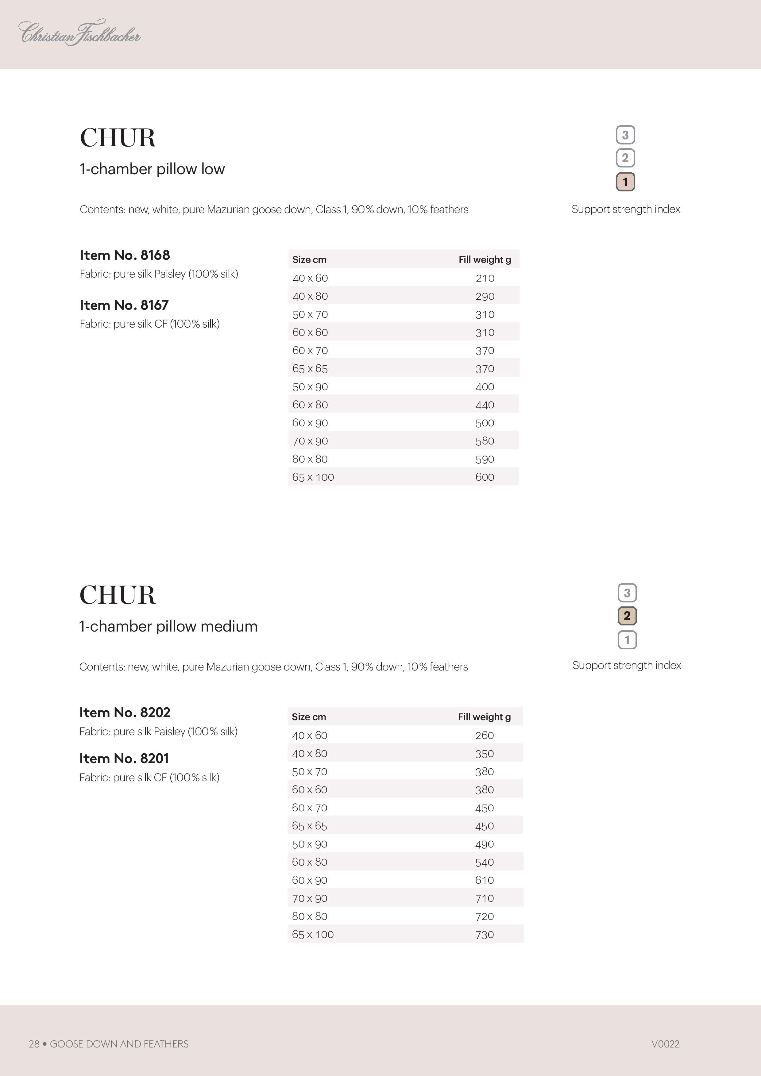 Vysoce kvalitní prachové peří a peří jako výplňový materiál • Všechny výrobky z prachového peří a peří byly oceněny exkluzivní pečetí VSB a jsou vyráběny ve Švýcarsku nebo Lichtenštejnsku. • Používáme pouze to nejlepší prachové peří a peří z „veselé husy krmené ovsem“ z Mazur v Polsku. • Pro naše přikrývky z kajčího peří se používá ručně vybírané islandské kajčí peří, nejexkluzivnější výplňový materiál na světě.Vysoce kvalitní přírodní srst a syntetická vlákna • Nejkvalitnější výplně, jako je jačí srst nebo divoké hedvábí, pro milovníky exkluzivních lůžkovin z přírodního vlasu. • Nabídku doplňují výrobky z vysoce kvalitních syntetických vláken, které jsou vyrobeny z nejjemnějších polyesterových vláken.Potahové tkaniny nejvyšší kvality • Pro tkaniny našich péřových přikrývek používáme SWISS BATIST, který se vyznačuje jedinečným omakem, lehkostí a vysokou prodyšností. • Hedvábné tkaniny jsou obzvlášť měkké a působí luxusně. • Všechny výrobky získaly označení OEKO•TEX®.Jaký je index pevnosti podpory?Polštáře by měly podpírat hlavu a umožňovat uvolnění krčních svalů. Protože optimální tuhost závisí na individuálních spánkových návycích, vyvinula společnost DORBENA index pevnosti opory, který uvádíme na každém polštáři. Jak je uvedeno, nabízíme naše polštáře s výplní nízkou, střední, vysokou a nastavitelnou.Všechny hodnoty jsou orientační a mají pomoci při výběru přikrývky a polštáře.