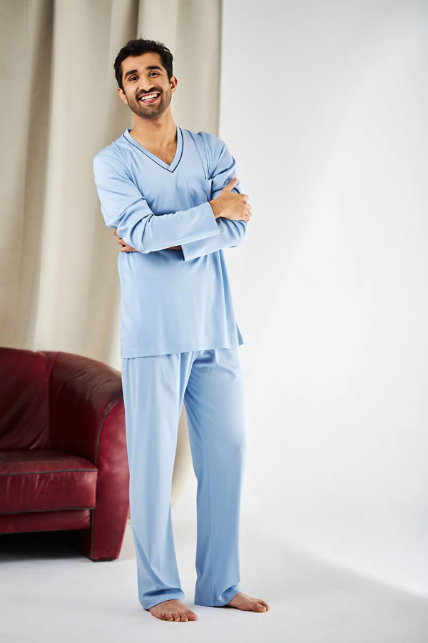 CLARA bedding nabízí Luxus na dosah—Bohatý výběr materiálů, barev a vzorů.• Exkluzivní pánské pyžamo - Modrá.• Příjemné, elgantní pánské pyžamo v klasickém designu z interlock jersey.• Horní díl je s dlouhým rukávem a náprsní kapsičkou. • Pohodlný výstřih do V.• Pyžamo doplňují dlouhé kalhoty.• Materiál - 100% mako bavlna - jersey (velmi jemný, měkký, lehký a splývavý materiál).• Velmi příjemný materiál k pokožce, pohodlné nošení.• Běžná údržba - možnost praní do 40°C.• Vysoká kvalita zpracování.• Vyrobeno v Německu.• Příjemný a komfortní spánek.
