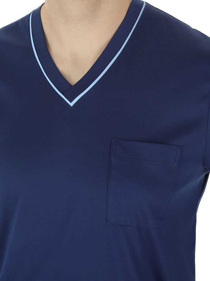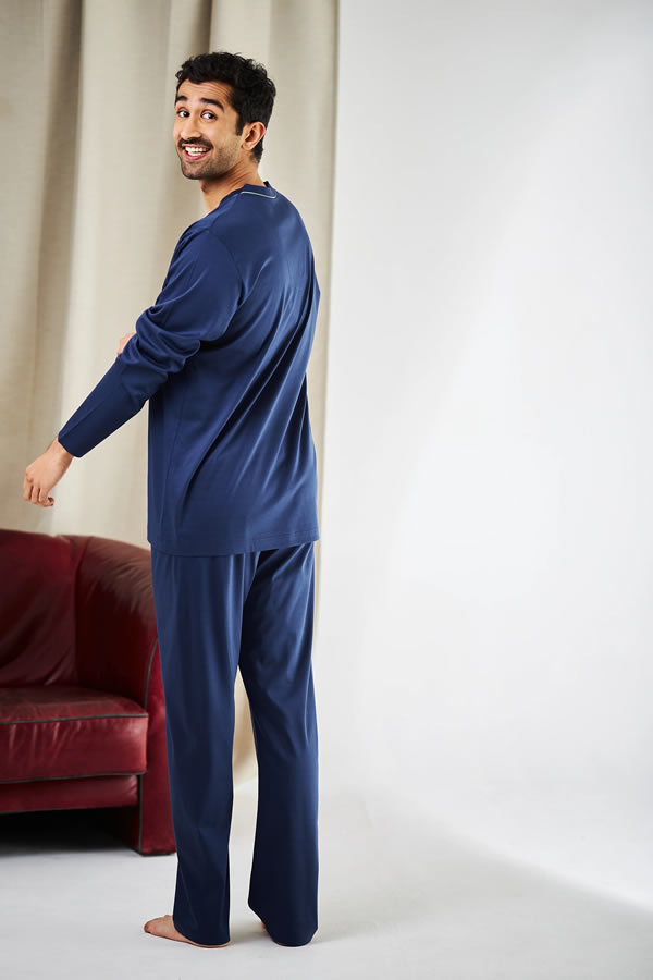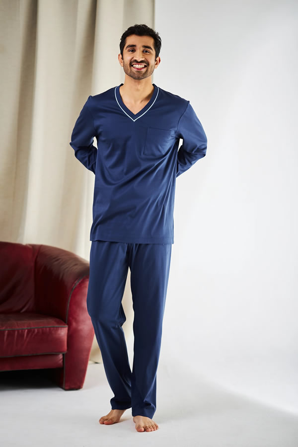 CLARA bedding nabízí Luxus na dosah—Bohatý výběr materiálů, barev a vzorů.• Exkluzivní pánské pyžamo - Marine Modrá.• Příjemné, elgantní pánské pyžamo v klasickém designu z interlock jersey.• Horní díl je s dlouhým rukávem a náprsní kapsičkou. • Pohodlný výstřih do V.• Pyžamo doplňují dlouhé kalhoty.• Materiál - 100% mako bavlna - jersey (velmi jemný, měkký, lehký a splývavý materiál).• Velmi příjemný materiál k pokožce, pohodlné nošení.• Běžná údržba - možnost praní do 40°C.• Vysoká kvalita zpracování.• Vyrobeno v Německu.• Příjemný a komfortní spánek.