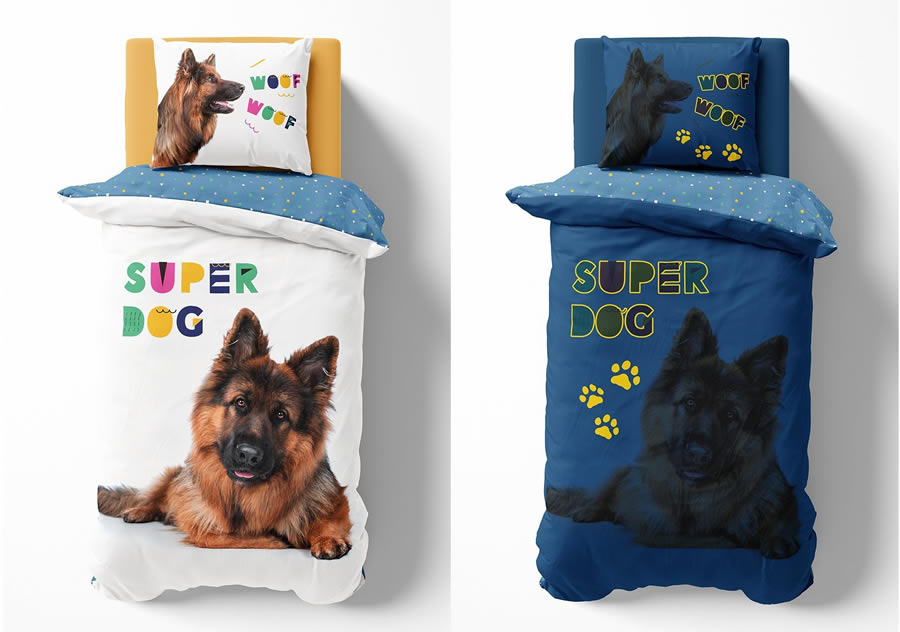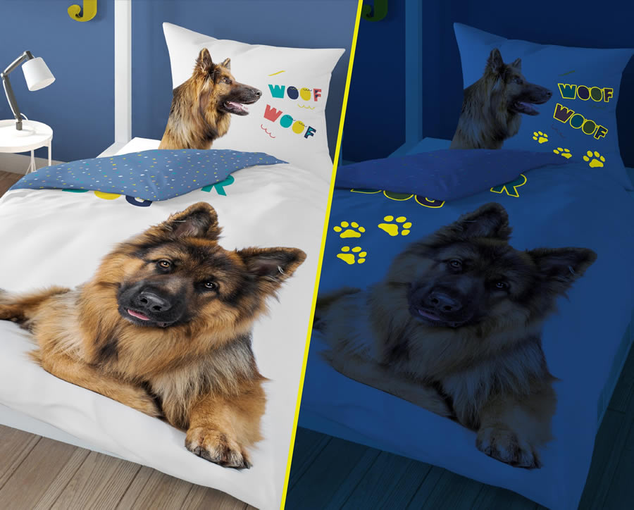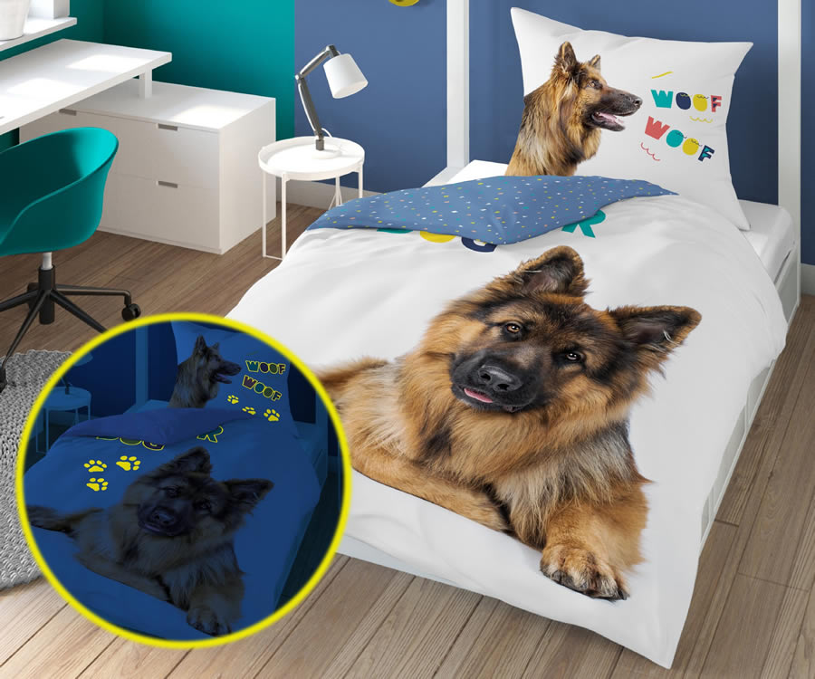 • Hravé bavlněné povlečení, které ve tmě svítí - Haf Haf - Super Pes - Máme Rádi Zvířata - Přátelství - Tlapku na to.