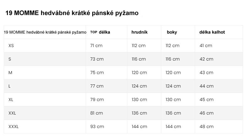 CLARA bedding nabízí Luxus na dosah—Bohatý výběr materiálů, barev a vzorů.• Luxusní Krátké Pánské Pyžamo CLARA Silk Dreams - černé - pyžamo z pravého hedvábí - Vyspěte se do krásy. • Skvostné hedvábné pyžamo s Anti-Aging efektem. Hedvábné pyžamo proti stárnutí s jemným leskem je projevem perfektního stylu a vysoké elegance.• Zpracování: Černá a bílé hedvábné lemování.• Materiál: 100% pravé hedvábí - (způsob tkaní: saténová vazba) - (100% morušové hedvábí třídy 6A).• Hedvábný protein sericin, který tkanina obsahuje, se spojuje s keratinem v pokožce a tvoří na ní homogenní ochrannou vrstvu. Přirozené aminokyseliny zadržují vlhkost ve vlasech, které jsou následně hladší a i v pokožce a tím působí proti vráskám. Můžete tedy objevit hedvábné tajemství anti-agingového působení během Vašeho spánku.• Hedvábná tkanina ulevuje od nepříjemných doprovodných projevů menopauzy, má omlazující účinky a dokonce blahodárně působí při opakujících se potížích na intimních místech.• Hedvábí je přirozeně antistatické, hedvábí je nejvíce hypoalergení ze všech látek, je odolné proti prachům i roztočům, proto je hedvábné pyžamo velmi vhodné pro lidi s alergiemi, kožními problémy, astmatem apod ...• Hedvábná tkanina - Ideální na spaní - vlastnosti regulující teplotu vám účinně pomohou při spánku tím, že odvádějí vlhkost od těla a přizpůsobují se vaší tělesné teplotě.• Hedvábí má mnoho výhod - super měkké, pohodlné a poddajné, skvěle prodyšné, nejlepší pro péči o pokožku, proti stárnutí, antibakteriální; antialergické, ideální pro alergiky.• Nechte se hýčkat hedvábně měkkou kvalitu pravého hedvábí.• Údržba - praní na 30°C - perte vždy naruby, doporučujeme prát v sáčku na praní a používat jen prací prostředky na hedvábí nebo jemné prádlo. Maximálně šetrné odstřeďování.• Nápad na dárek: Hedvábné pyžamko je krásným dárkem, který potěší.• Pro maximální zážitek z hlubokého spokojeného spánku.• Toto zboží je vyráběno na zakázku z metráže hedvábí na základě konkrétních požadavků kupujícího.