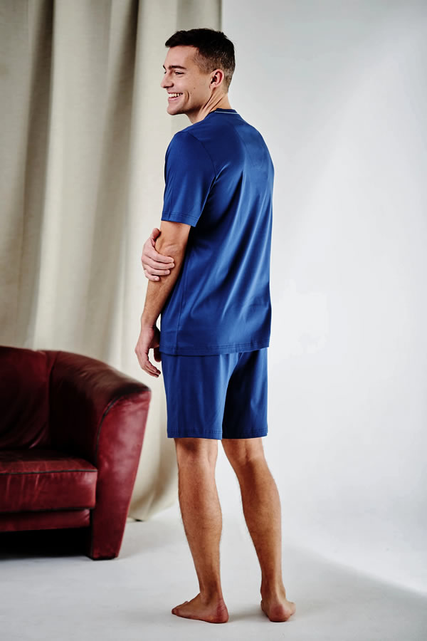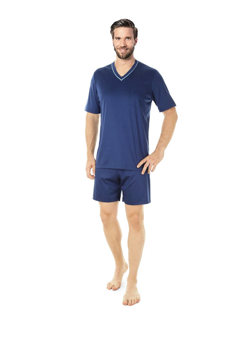 CLARA bedding nabízí Luxus na dosah—Bohatý výběr materiálů, barev a vzorů.• Exkluzivní pánské pyžamo - Šortky - Marine Modrá.• Příjemné, elgantní pánské pyžamo v klasickém designu z interlock jersey.• Horní díl je s krátkým rukávem a náprsní kapsičkou. • Pohodlný výstřih do V.• Pyžamo doplňují krátké kalhoty (šortky).• Materiál - 100% mako bavlna - jersey (velmi jemný, měkký, lehký a splývavý materiál).• Velmi příjemný materiál k pokožce, pohodlné nošení.• Běžná údržba - možnost praní do 40°C.• Vysoká kvalita zpracování.• Vyrobeno v Německu.• Příjemný a komfortní spánek.