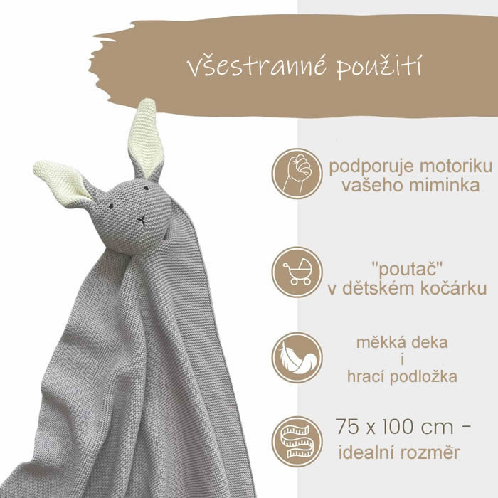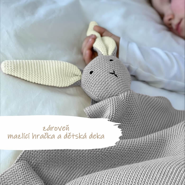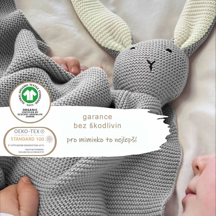 CLARA bedding nabízí Luxus na dosah—Bohatý výběr materiálů, barev a vzorů.• Mazlivá Dětská - Baby - Deka - Zajíček - Světle Šedá. • Dětská deka z bio bavlny má rozměr 75x100cm. Má jemný úpletový vzor s mazlivým „zajíčkem“.• Dětská pletená deka se skládá z jednoduchého pleteného vzoru.• Podporuje dětskou motoriku.• Materiál - 100% Bavlna - Bio Bavlna - GOTS.• GOTS je nejpřísnější certifikace pro textilie vyrobené z organických textilních vláken. GOTS kontroluje celý výrobní proces od sklizně bavlny, tkaní vláken, až po výrobu finálního produktu.• Velmi příjemná, lehká, měkká.• Rozměr 75x100cm.• Běžná údržba - možnost praní do 30°C.• Mazlivé lenošení i pro zahřátí.• Také pěkný tip na dárek k narození miminka nebo křtu - ať už jste teta a strýc, kmotr či kmotra nebo prarodiče, kamarád i kamarádka.• Díky svému jemnému designu lze tuto deku použít jako dárek při narození miminka, ke křtinám - při slavnostním křtu nebo jako jednu z rekvizit při focení miminka. Dětskou bavlněnou deku lze použít pro chlapce i dívky. Je k dispozici v jemných unisex barvách starorůžové, šedé a hnědé. Jejich stylový design ozdobí každý dětský pokojíček a neměl by chybět v počáteční výbavě žádného miminka.