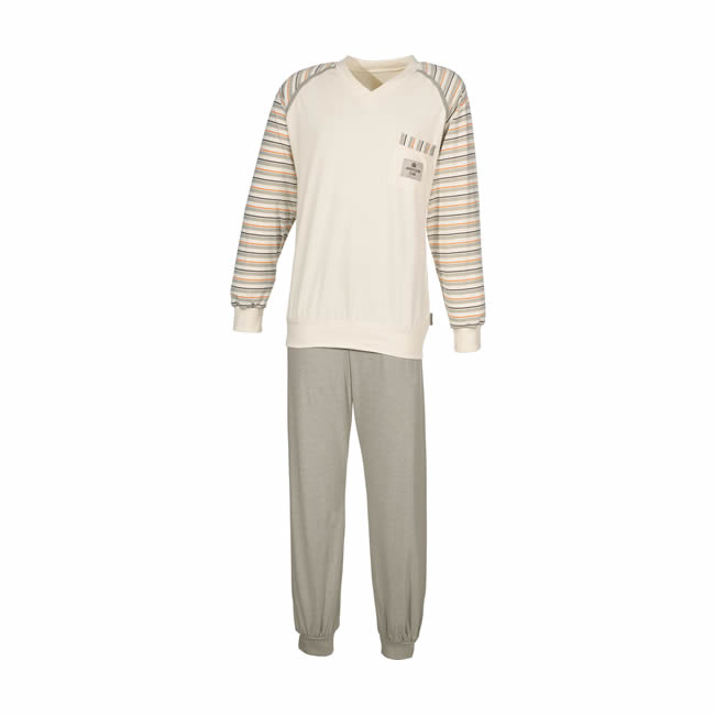 CLARA bedding nabízí Luxus na dosah—Bohatý výběr materiálů, barev a vzorů.• Pánské pyžamo v přírodních tónech. • Sportovní look.• Materiál - 100% EKO česaná bio bavlna - jersey.• Bio Bavlna - Nebělená bavlna - pěstovaná bez pesticidů - bez genetických modifikací - přátelská k alergikům - příjemná k pokožce - ekologický výrobek.• Dlouhé kalhoty ukončené pružnou manžetou.• Výstřih do V, dlouhý rukáv ukončený pružnou manžetou, náprsní kapsička.• Běžná údržba - možnost praní na 60°C.• Nechte se rozmazlovat Bio Bavlnou.• Příjemný spánek.