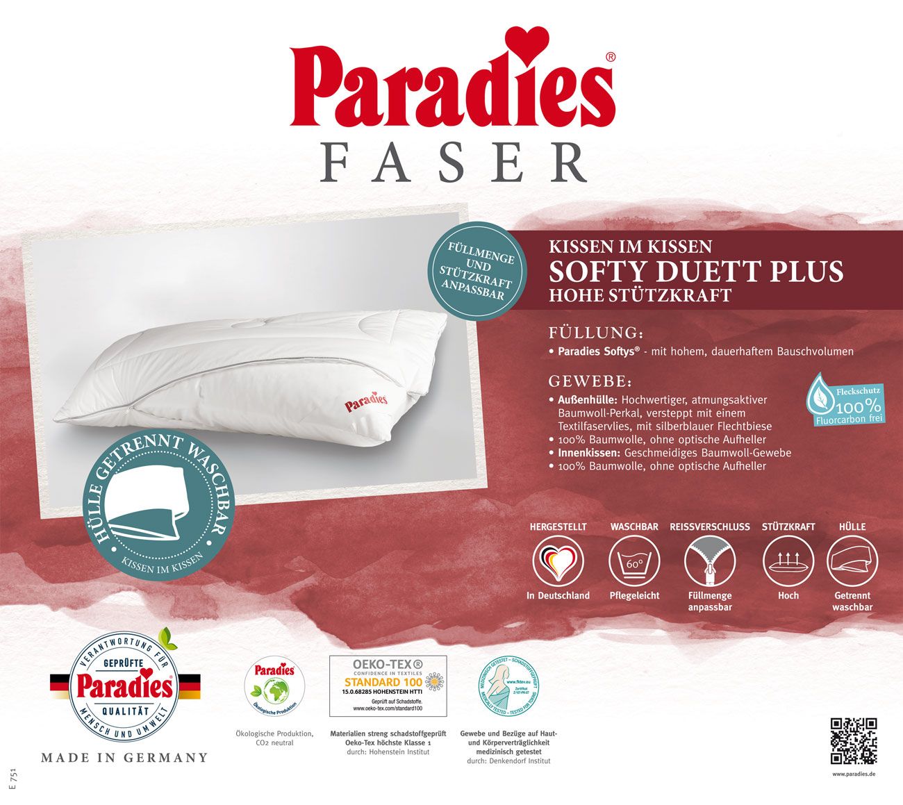 CLARA bedding nabízí Luxus na dosah—Bohatý výběr materiálů, barev a vzorů.• Polštář ze série Softy - Tip Medium - Paradies.• Polštář Softy Duett Plus poskytuje obzvláště dobrou oporu pro oblast hlavy a krku. Péče o tento polštář je velmi snadná, protože vnější polštář lze pro praní oddělit od vnitřního polštáře. • Vnitřní polštář je vyplněn vlákny Softys, který se snadno udržuje a lze jej samozřejmě také prát. • Množství výplně lze díky zipu individuálně měnit. • Inovativní povrchová úprava na ochranu skvrny chrání polštář před nečistotami a zajišťuje zlepšené vlastnosti péče (100% fluorouhlík). • Povlak na polštář a vnitřní polštář lze prát až do 60°C a jsou vhodné pro sušení v bubnu.• Potah polštáře je Mako jemný perkal 100% bavlna.• Náplň: Paradies Softys Medium - vláknité kuličky - duté vlákno - 100% Polyester.• Komfortní podporu hlavy a krku.• Prošití: se zipem.• Barva: bílá.• S ochranou proti ušpinění.• Praní na 60°C , doporučujeme prát v pracím sáčku.• Značková kvalita - vyrobené v Německu.• Polštář je velmi měkký a nadýchaný.• Optimální klima pro spánek.• Celkový počet gramů udává hmotnost náplně polštářku.