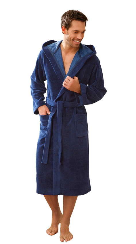 • Elegantní wellness župan s kapucí v barvě námořní modři - kombinuje tmavší a světlejší odstín modré barvy (vnější strana je tmavší a vnitřní světlejší).
