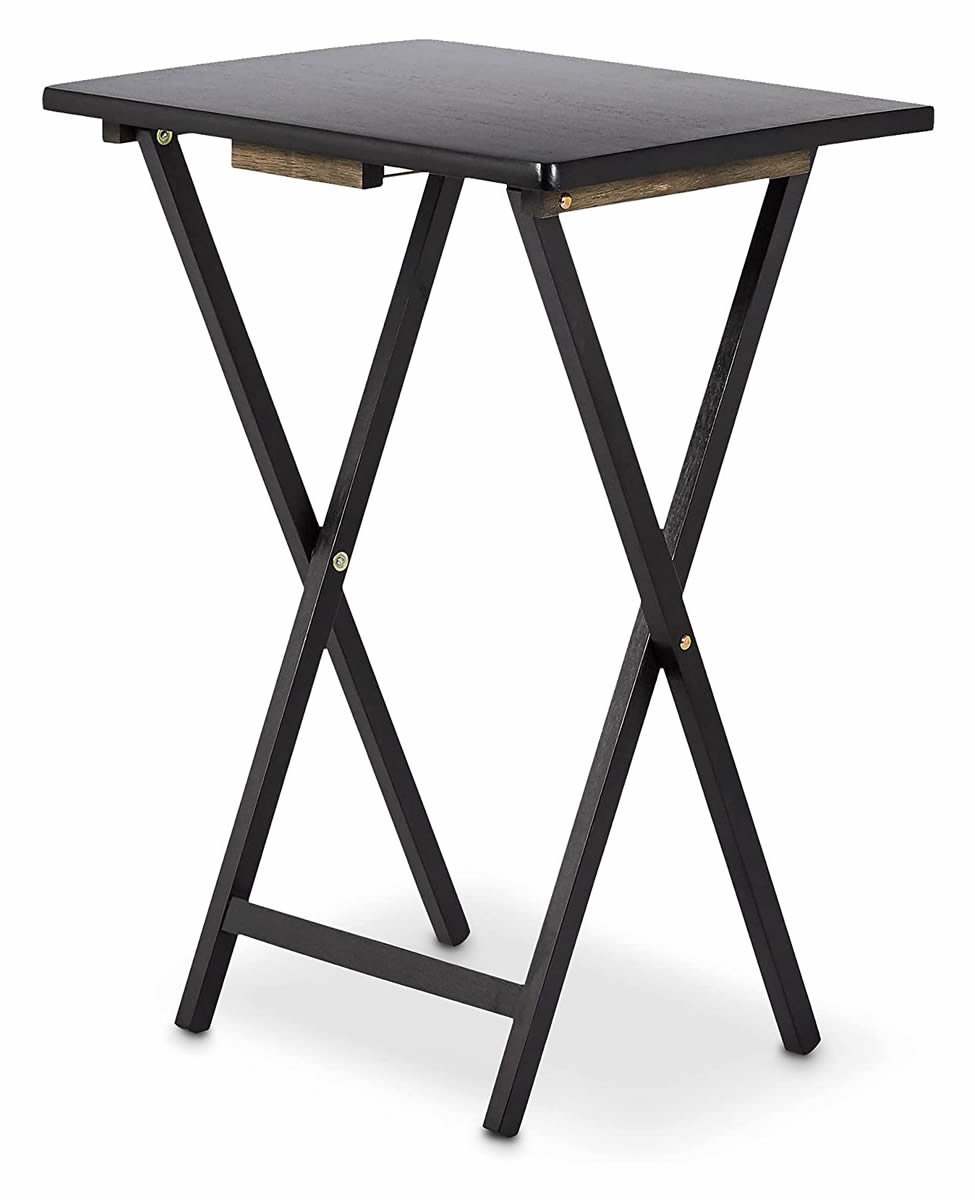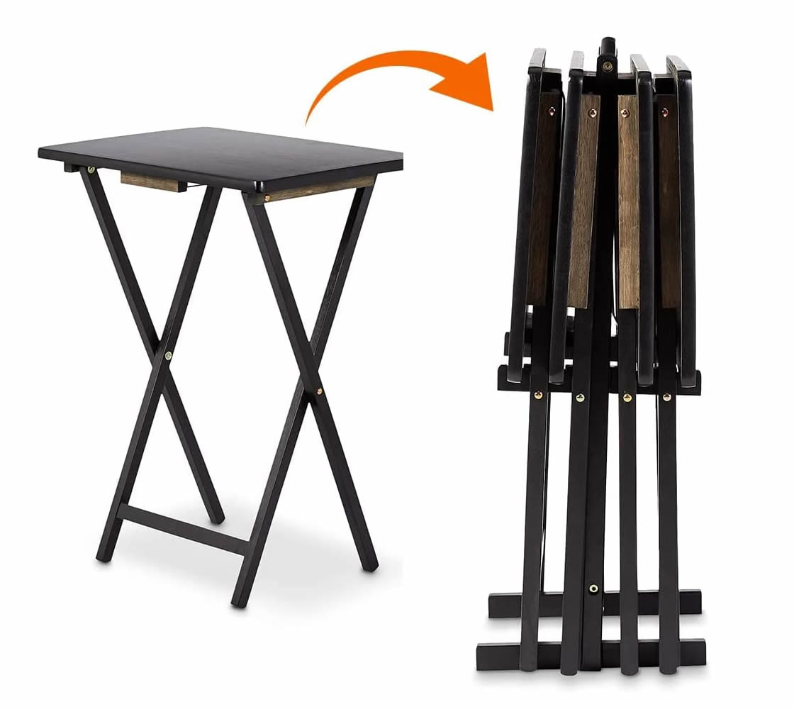 CLARA bedding nabízí Klasiku i Luxus na dosah - Nechte se inspirovat.• Sada čtyř skládacích stolků.• Stabilní dřevěná konstrukce s širokou stolní deskou.• Vychutnejte si večeři nebo svačinu před televizí, použijte podnos jako pracovní nebo hrací plochu a mnoho dalšího.• Každý podnos lze složit naplocho a prostorově úsporně uložit.• Klasický, stylový vzhled, který se snadno hodí do většiny místností.• Barva: černá.• Rozměry: 206;48 x 38 x 66 cm. • Hmotnost: 13,2 kg.• Materiál: dřevo.• Speciální vlastnosti: skládací.