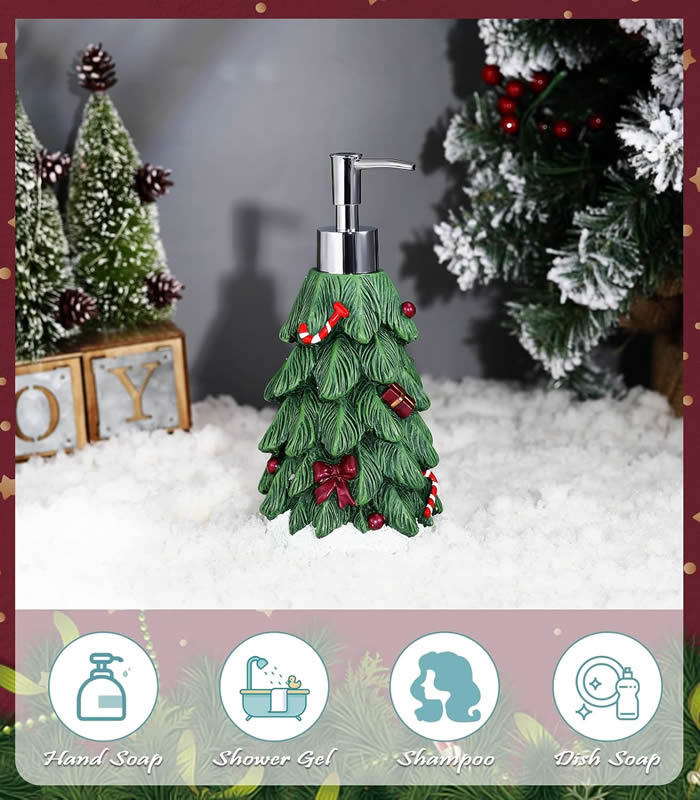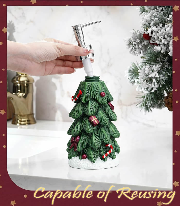 CLARA bedding nabízí Luxus na dosah—Bohatý výběr materiálů, barev a vzorů.• Dávkovač ve tvaru vánočního stromečku pro útulnou atmosféru během svátků.• Leze napnit tekutým mýdlem, šampónem, sprchovým gelem, prostředkem na nádobí, lotion, odličovací mléko, masážní olej, tělový olej, dezinfekční prostředek na ruce, apod...• Dávkovač vhodný do koupelny, kuchyně, k umyvadlu, ke dřezu... , ale i do kosmetického salonu pro krásnou atmosféru svátků.• Zimní elegance.• Objem: 400ml.• Dodáváno bez mydla.• Dávkovač mýdla z kvalitního pryskyřičného materiálu je velmi robustní a má dlouhou životnost. Hlava dávkovače je nerezová a odolná proti vytečení, lze ji snadno stlačit a má dlouhou životnost.• Hezké i jako vánoční dárek.• Příjemné vánoční období.