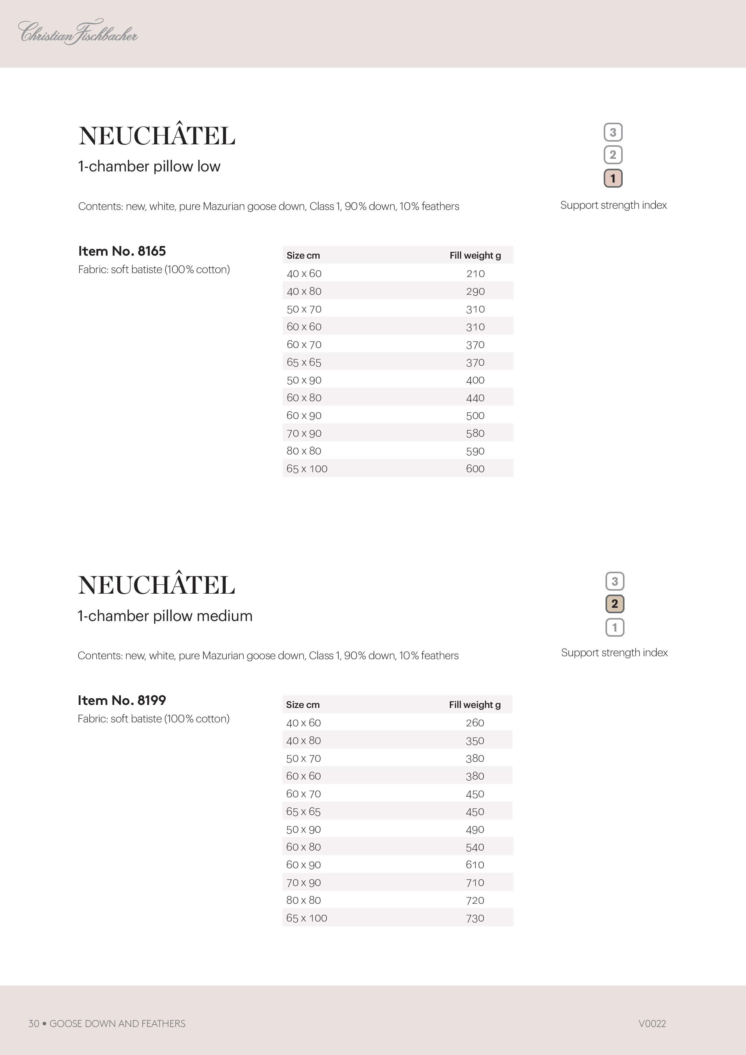 Vysoce kvalitní prachové peří a peří jako výplňový materiál • Všechny výrobky z prachového peří a peří byly oceněny exkluzivní pečetí VSB a jsou vyráběny ve Švýcarsku nebo Lichtenštejnsku. • Používáme pouze to nejlepší prachové peří a peří z „veselé husy krmené ovsem“ z Mazur v Polsku. • Pro naše přikrývky z kajčího peří se používá ručně vybírané islandské kajčí peří, nejexkluzivnější výplňový materiál na světě.Vysoce kvalitní přírodní srst a syntetická vlákna • Nejkvalitnější výplně, jako je jačí srst nebo divoké hedvábí, pro milovníky exkluzivních lůžkovin z přírodního vlasu. • Nabídku doplňují výrobky z vysoce kvalitních syntetických vláken, které jsou vyrobeny z nejjemnějších polyesterových vláken.Potahové tkaniny nejvyšší kvality • Pro tkaniny našich péřových přikrývek používáme SWISS BATIST, který se vyznačuje jedinečným omakem, lehkostí a vysokou prodyšností. • Hedvábné tkaniny jsou obzvlášť měkké a působí luxusně. • Všechny výrobky získaly označení OEKO•TEX®.Jaký je index pevnosti podpory?Polštáře by měly podpírat hlavu a umožňovat uvolnění krčních svalů. Protože optimální tuhost závisí na individuálních spánkových návycích, vyvinula společnost DORBENA index pevnosti opory, který uvádíme na každém polštáři. Jak je uvedeno, nabízíme naše polštáře s výplní nízkou, střední, vysokou a nastavitelnou.Všechny hodnoty jsou orientační a mají pomoci při výběru přikrývky a polštáře.